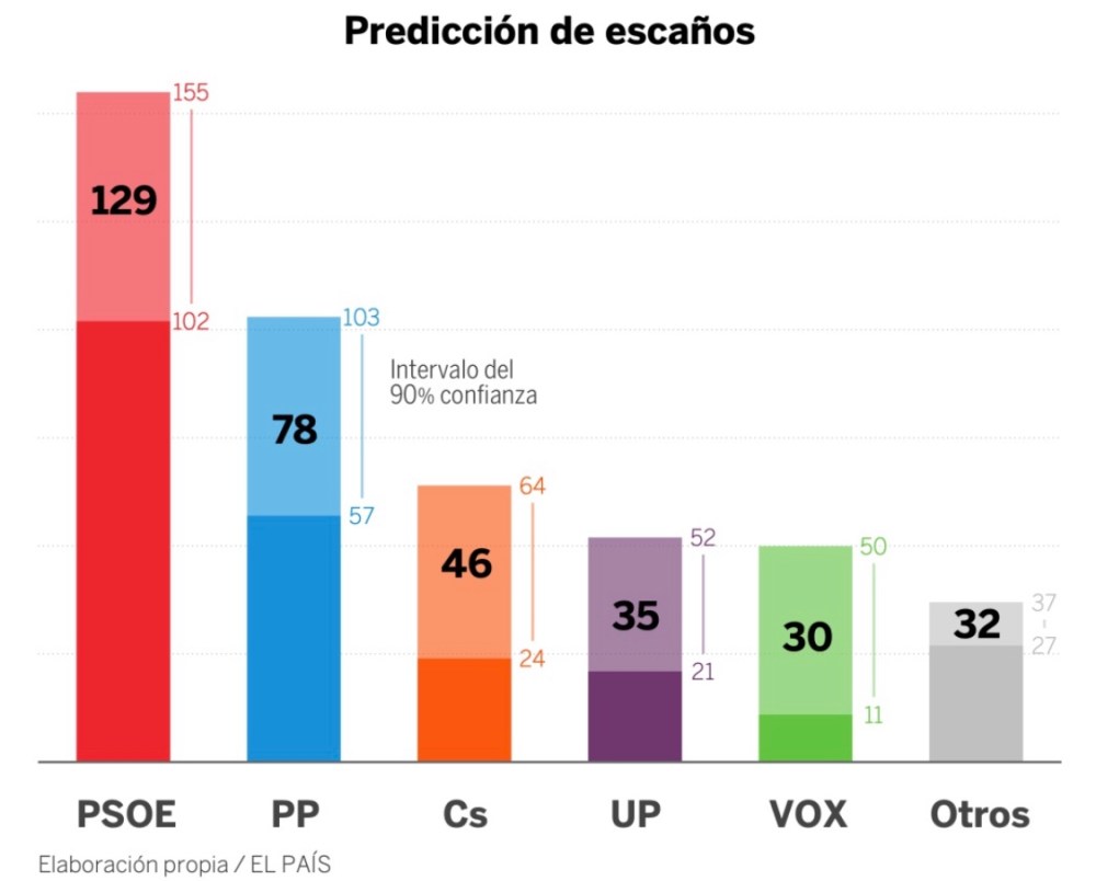 De acordo com a última pesquisa publicada no El País, o PSOE lidera com certa folga a intenção de voto para o Congresso e tem boa chance de conquistar maioria com o Podemos (UP no gráfico) e alguns partidos menores de esquerda. Porém, uma maioria formada pelos três partidos de direita não está descartada.